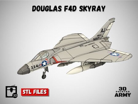 DOUGLAS F4D SKYRAY . It was in service for a relatively short time (1956–1964) and never entered combat but it was the first carrier-launched aircraft to hold the world's absolute speed record at 1211.744 km/h and the first US Navy and US Marines corps fight that could exceed MACH 1 in level flight It's very original and beautiful with his delta wing and equiped with external fuel tank , missiles and rocket pod a small PDF guide is provided to help you to print your model and to assemblr it correctly Take a look to my new Facebook page her : https://www.facebook.com/3DPrintedARMY like it and follow me for lot of new models and my Pinterest page here https://www.pinterest.fr/3DprintedARMY/_created/
