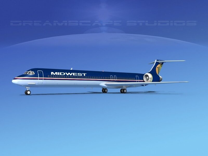 McDonnell Douglas MD83 Midwest This model was originally built in Max 13 near to scale (within 3-4% of scale) and fully textured. It comes with all the materials and textures shown in renderings here. It has a detailed exterior including radio antennas and pitot tubes. Landing gear have been finished with a moderate amount of detail too. It comes with animateable ailerons, flaps, elevators, rudder, landing gear, landing gear doors and turbines. It is available in several formats for a wide variety of end users. This model comes with many different liveries. It is built to be used in in-flight or airport ground animations and video or simulation. It can also be used to populate an airport scene. MD-83 is a longer range version of the MD-81 basic family model aircraft. It has a greater fuel capacity with two additional fuel tanks and more powerful engines. The -83 also has higher operating weights and it could carry up to 155 passengers and had a range of 2500 miles. The first one was delivered in 1985 and the last was delivered in 1999.