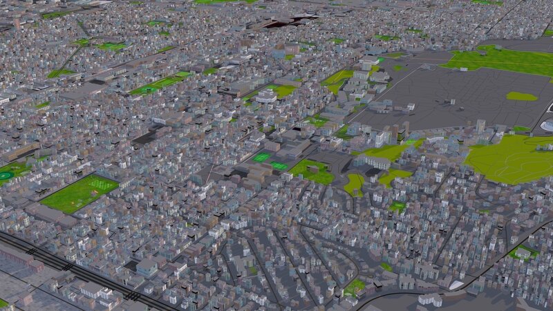 3D representation of Montreal_USA using 2021 map data c4d/maya/blender scene will render perfectly. For other formats import in your 3d program and use physical sky and sun. No global illumination used. Perfectly unwrapped uv proper materials and naming. No complex shaders used, all are textures. You will get same look in all 3d program. If the building textures not scaled correctly use cubic/box/triplanar projection instead of UV.