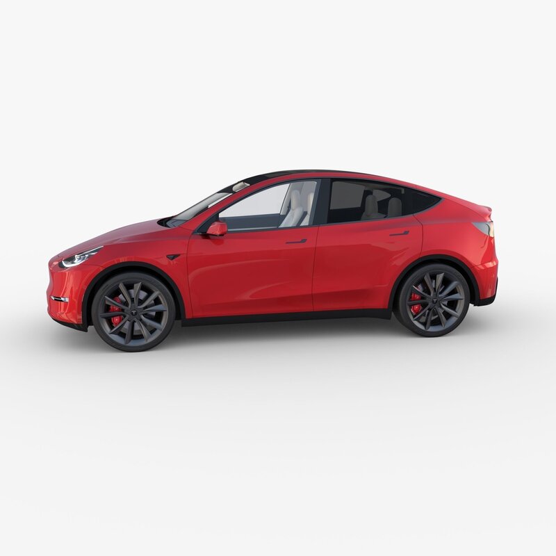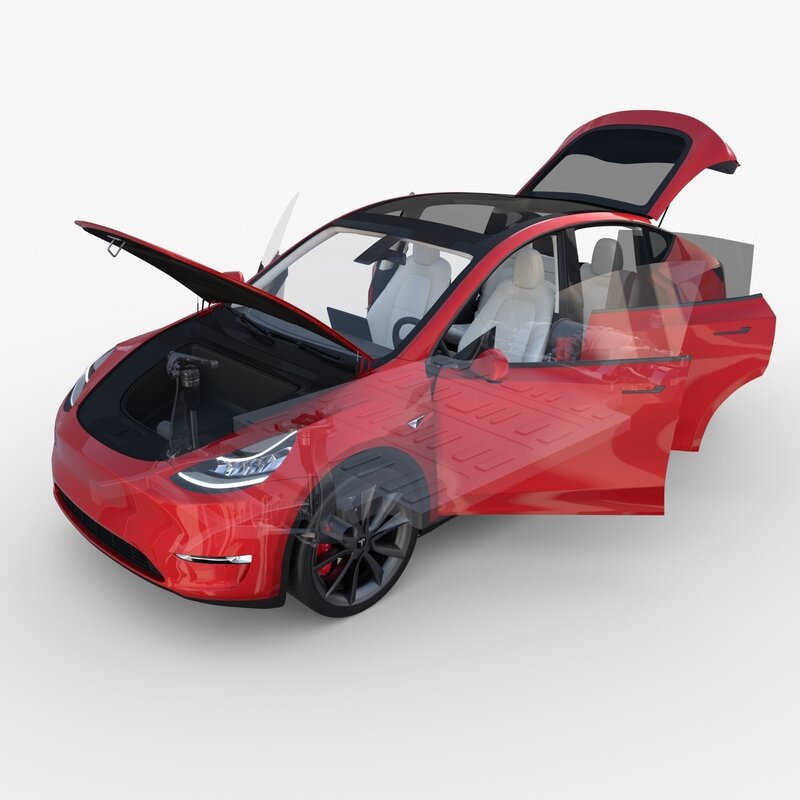 Tesla Model Y RWD with full chassis (battery pack, rear motor setup, brakes, linkages, suspension, steering) and a detailed interior 3d model rendered with Cycles in Blender, as per seen on attached images.