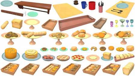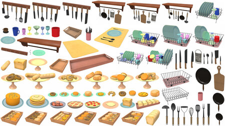 A collection of 3D models, which consists of cartoon kitchen props, 91 base models (58 main models).