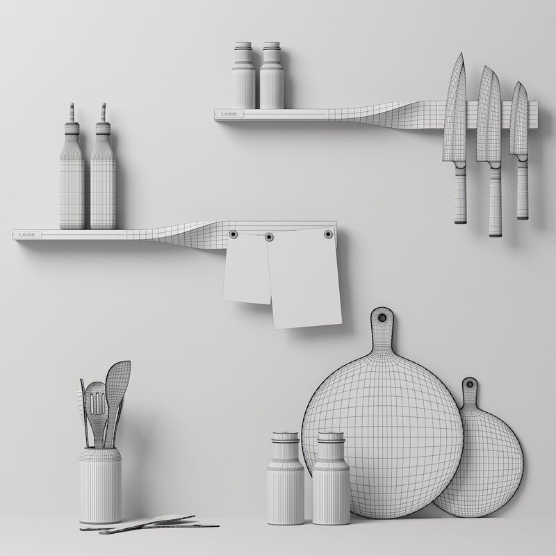 *This 3d model Decor Set 91 Rolled shelves, kitchen boards, oil bottles, spice jars, knives and spatulas in a vase has fully textured, detailed design that allows for close-up realistic renders. *