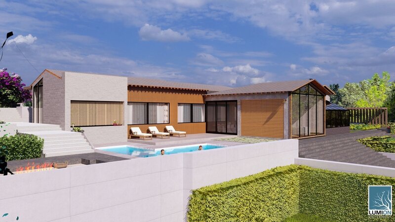 specially designed ecological village house project interior and landscape renderingIn the main building, 1 master bedroom, 2 children's rooms, living room, kitchen, WC, bathroom, entrance and hall are specially designed.In the annex building, areas such as garage, energy room, water tank were designed. A special hobby area, viewing area and landscaping work were carried out in the garden.