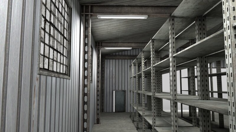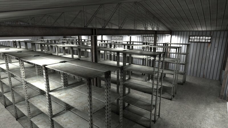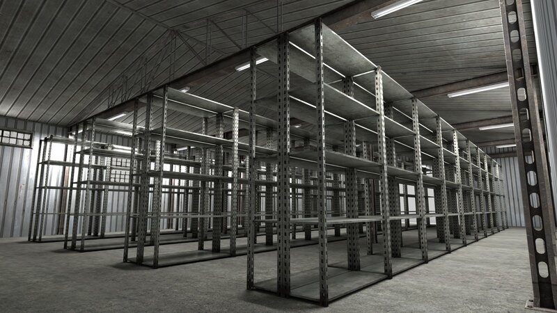 3D model of an empty warehouse, with empty storage shelving.