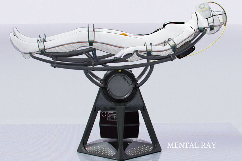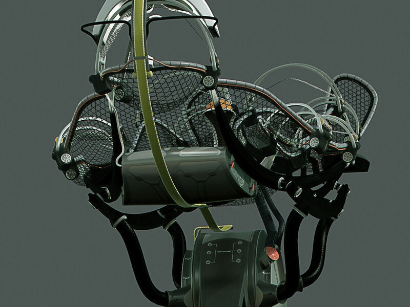 Two versions provided: Mental Ray with Arch & Design and Scanline with standard Max materials. A mannequin is included. The model poly count given is for the unsubdivided hammock only. Model is animated with bracelet unlocking and a skinned visor cable. Model has diffuse, specular and bump mapping. HDR used for reflections. Model is adapted for realtime graphics, all textures power of two, standard Max materials used. Rendered in Scanline mode, model will render as seen in previews. Lense effects added in Photoshop. Layered PSD maps included for customisation.